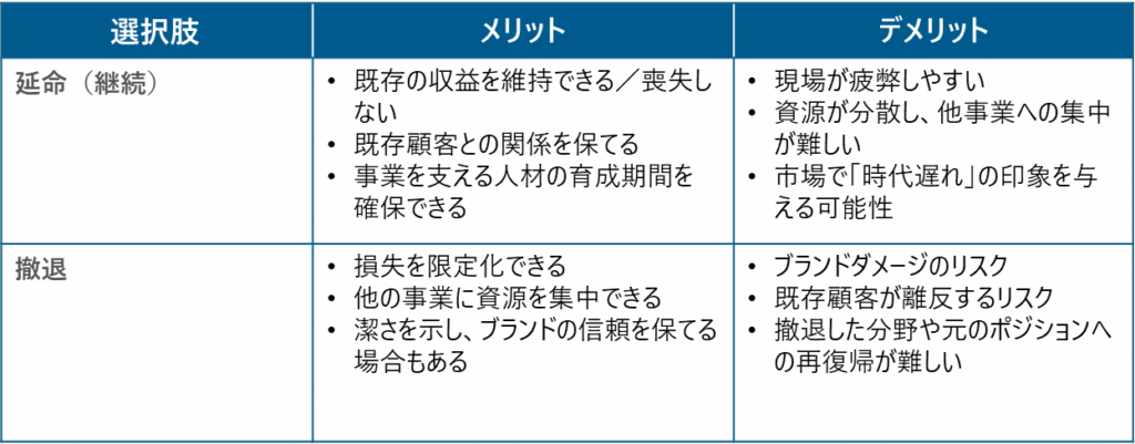 そんな二項対立に見えがちですが、実際はどちらも状況次第です。もし市場を創れる人材がいれば延命は未来を切り拓く手段になり得ますし、人がいなければ撤退は集中を促す選択になります。